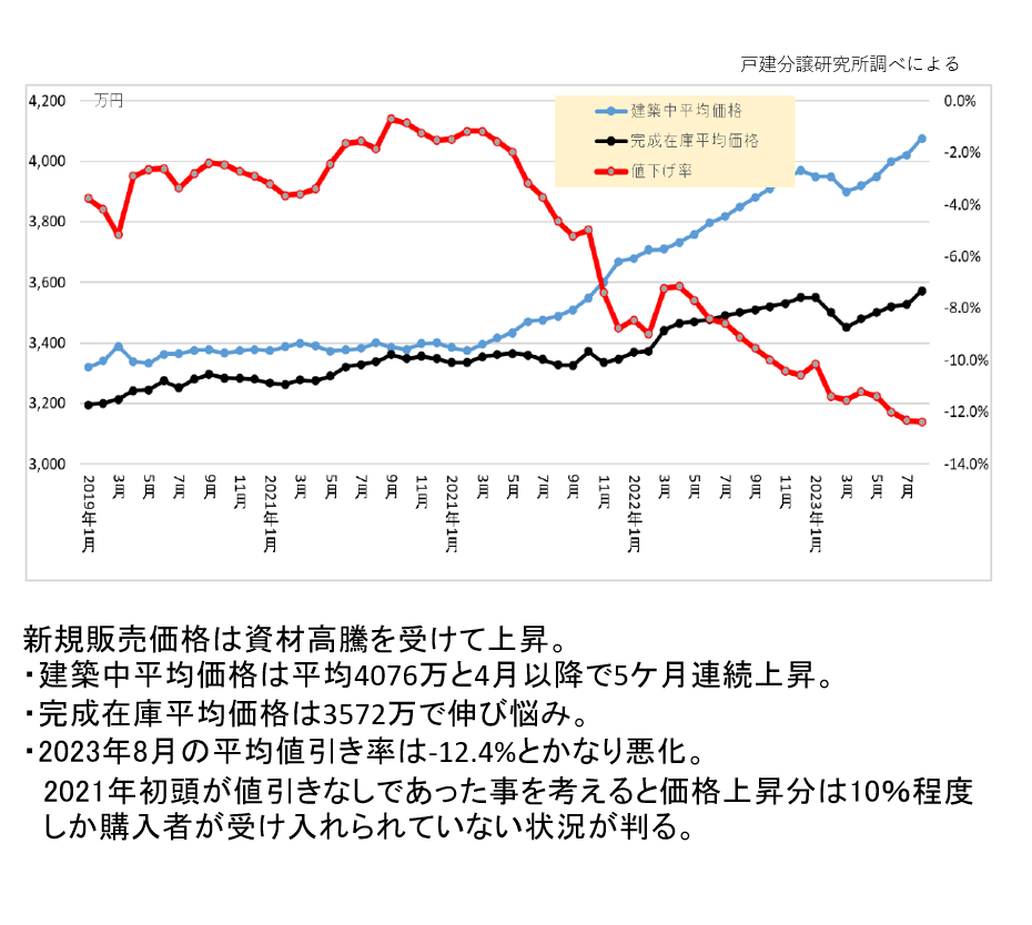 昨今の資材高騰を受けて価格に転嫁した新築価格設定を行うものの、実際の成約は伸び悩み。