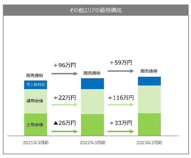 地方部でも土地の原価が33万円、建物原価が116万円、計149万円の増加に対し、販売価格への転嫁は59万円に過ぎません。