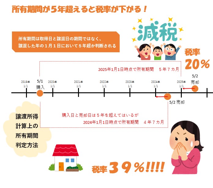 2015年5月1日に取得した不動産を2020年5月2日に売却した場合、5年経過していますが、2020年1月1日時点で判断するため、5年未満となり短期譲渡となります。したがって1月1日時点で5年を超えるには2021年以降に売却する必要があります。 この数カ月の売却タイミングによって税率が19%も違ってきます!!