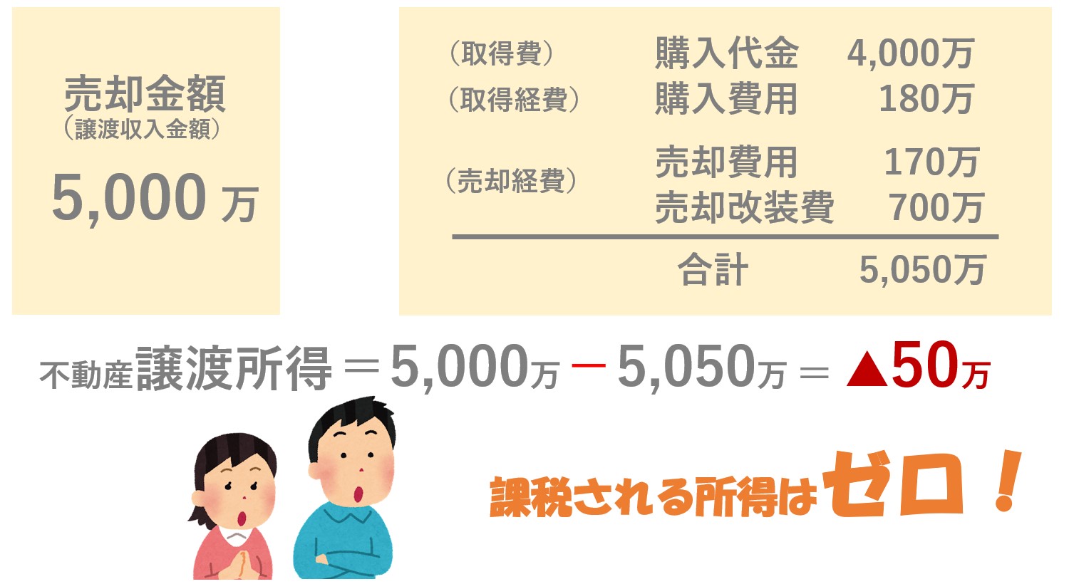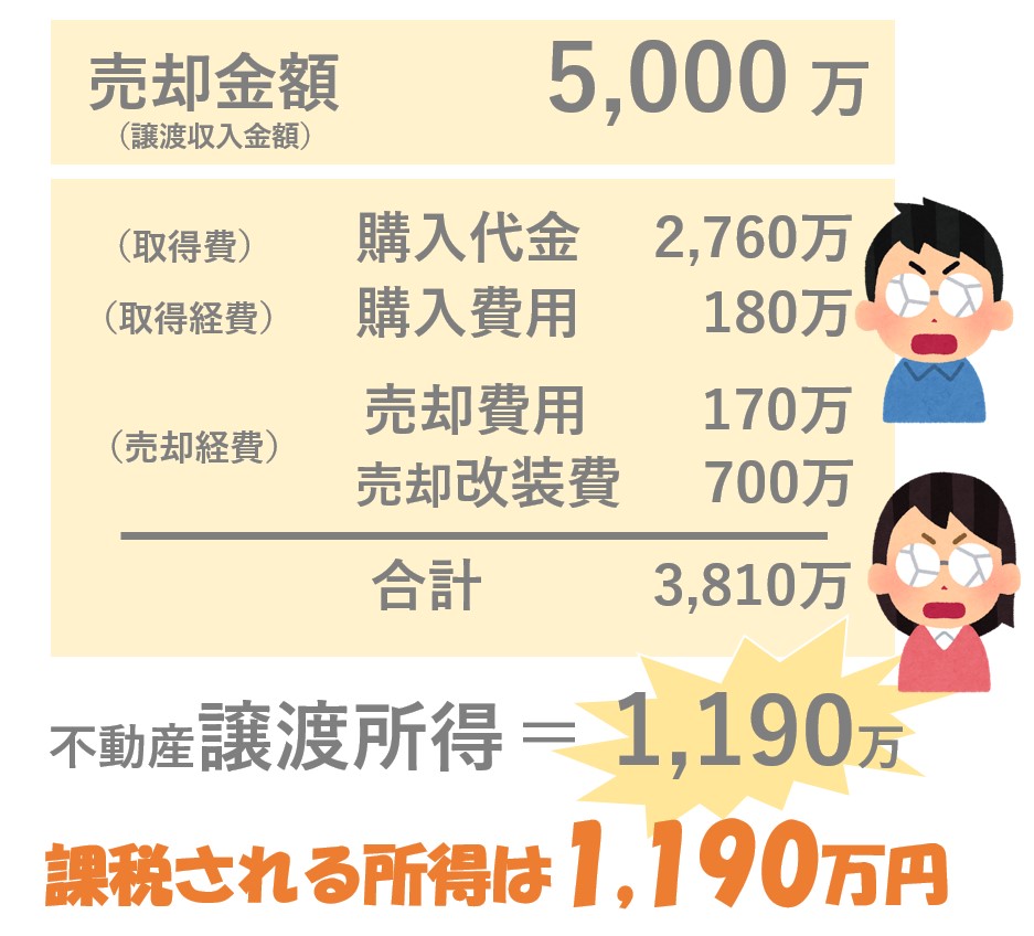 売却金額5,000万円から、不動産の取得費・取得経費、それに売却経費なども差し引いて、それでも利益(不動産譲渡所得)があれば課税される仕組みになっています。