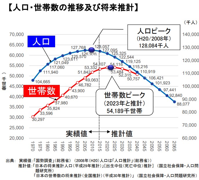 かつては一生涯で2件、3件と住宅など家屋を消費する時代もありました。そこに人口減です。両親・夫婦・子供が同居する昭和前半の世帯構成から世帯分離が進み、世帯数こそ伸び続けていましたが、それも2023年をピークに下降が始まり、空家の数も年々増加しています。