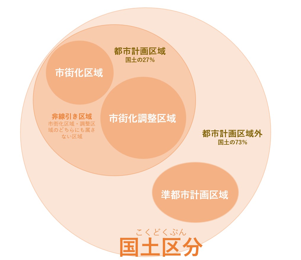 さらに都市計画法では、既に都市が形成されている、もしくは優先的かつ計画的な市街化を図る区域を「市街化区域」とし、無秩序な開発を防止し市街化を抑制すべき区域を「市街化調整区域」に区分し、どちらにも区分されていない地域を「非線引き区域」としています。