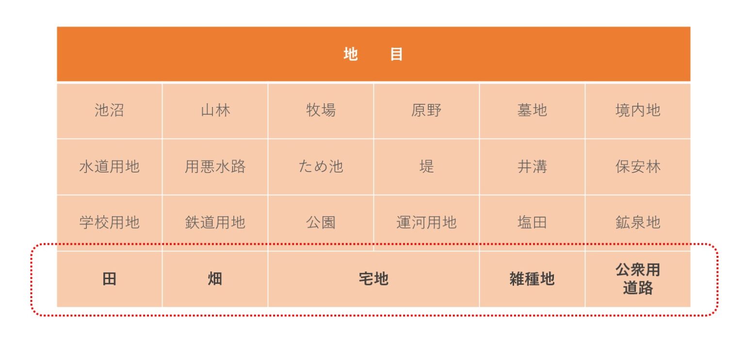 土地にはその用途に応じて「地目」が設定されていて、登記簿に記載されています。